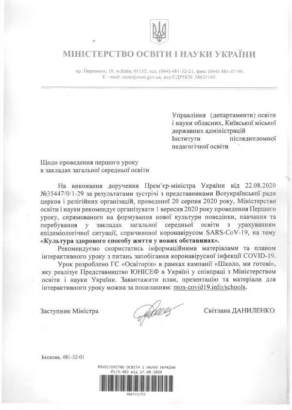 Завантажити: Лист МОН України від 27.08.2020 р. №1/9-483 "Щодо проведення першого уроку в закладах загальної середньої освіти"